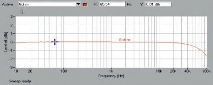 Pasmo przenoszenia (rys.1) wygląda idealnie przy 10 Hz (ledwie widoczny na wykresie spadek) oraz całkiem dobry poziom (-1,7 dB) na drugim skraju - przy 100 kHz.