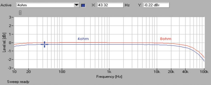 Charakterystyka przenoszenia (rys.1) jest dobrze wyrównana niemal w całym zakresie, przy 10 Hz spadek wynosi -0,2 dB, a przy 100 kHz -1,8 dB przy 8 omach oraz -1,9 dB przy 4 omach.