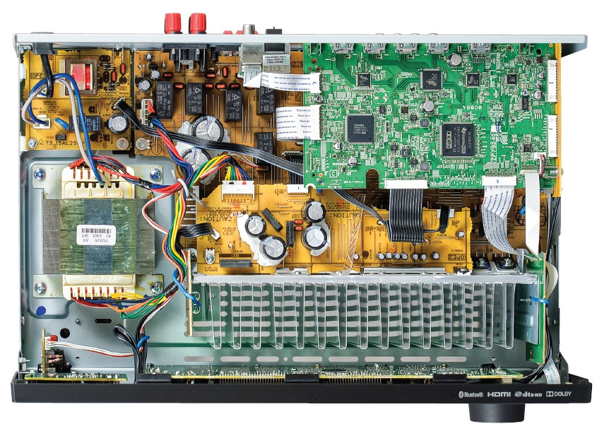 Także tutaj, podobnie jak w Denonie, końcówki mocy są tranzystorowe. Na płytce z układami cyfrowymi uwagę zwraca chip Yamaha DSP, odpowiadający za wiele kluczowych nastawień i operacji.