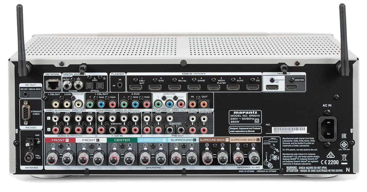 Do połączenia internetowego WLAN (LAN ma swoje gniazdo) wyposażono Marantza w zewnętrzną antenę; druga jest zarezerwowana dla układów Bluetooth. Wzmacniacze dla kolumn surround back mogą zostać przełączone do obsługiwania drugiej strefy lub, co wydaje się najważniejsze, dodatkowej pary dla Dolby Atmos lub DTS:X. SR5010 jest także "potencjalnie" przygotowany do przyjęcia oprogramowania dla DTS:X. Nie znalazłem jednak informacji, czy - podobnie jak w przypadku Denona - upgrade będzie możliwy jeszcze w tym roku.