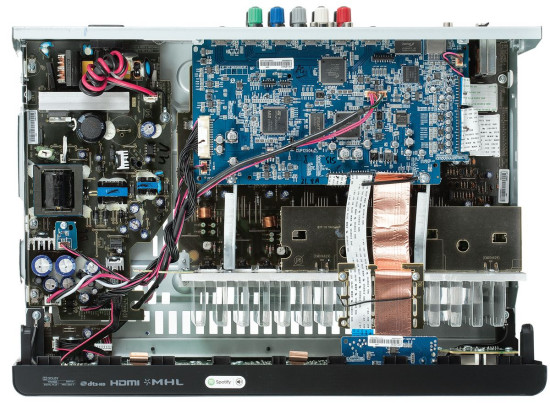Przetworniki C/A są skupione w ośmiokanałowym układzie Cirrus Logic CS42528, który Harman Kardon stosuje już nie pierwszy raz. Ciekawostką jest natomiast procesor DSP - jeden z najnowocześniejszych układów, zajmujący się dekodowaniem strumieni surround, również formatów Dolby Atmos, a także DTS:X, ale AVR161S nie wykorzystuje jego pełnego potencjału.