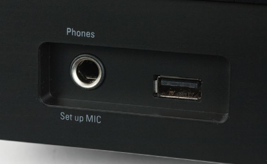 Rolę selektora wejść pełnią dwa przyciski (znajdują się w całym ich rzędzie). Za klapką ukryto wejście podręczne z dwoma gniazdami; pierwsze jest zarówno wejściem dla mikrofonu kalibracyjnego, jak i wyjściem słuchawkowym. Rola gniazda zmienia się w zależności od wybranego trybu pracy. Jest jeszcze złącze USB (typ-A) dla nośników pamięci oraz sprzętu Apple, np. iPhone`a.