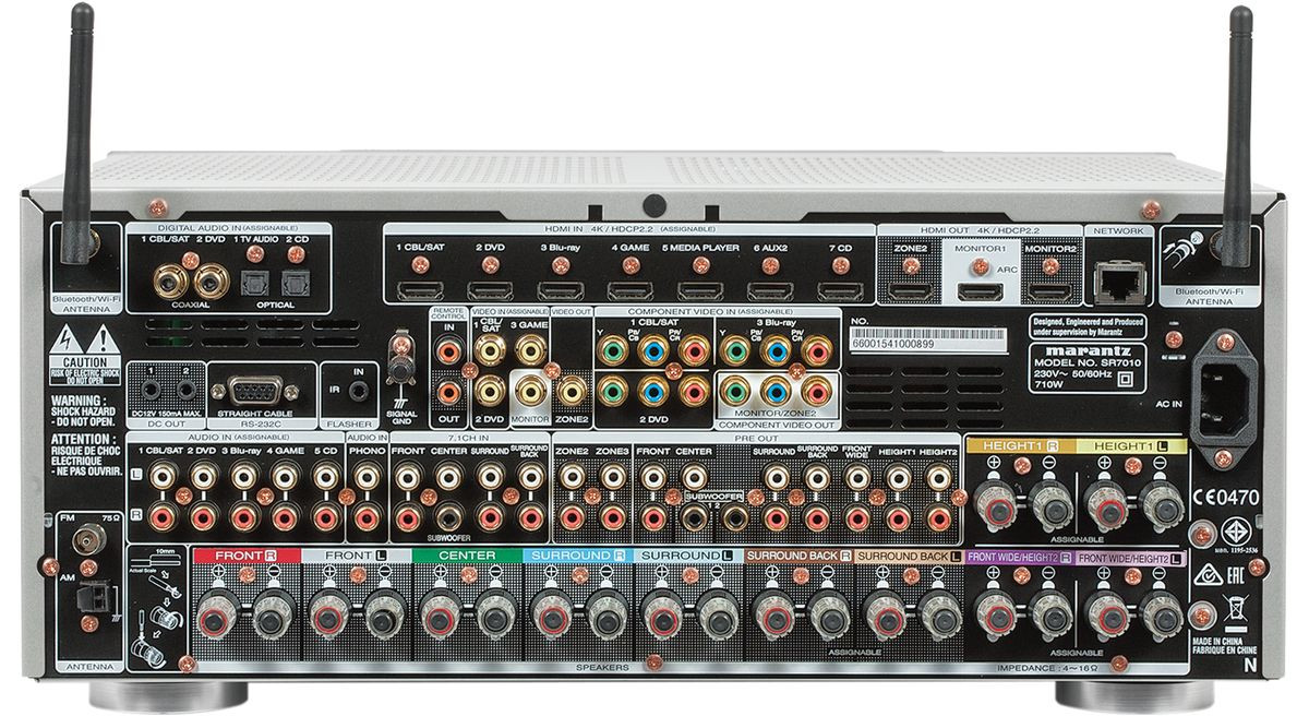 Wszystkie podłączenia HDMI w SR7010 mogą pracować z szerokością pasma konieczną dla 4K - dotyczy to także wyjścia dla 2 strefy. Anteny służą do komunikacji Wi-Fi oraz BT.