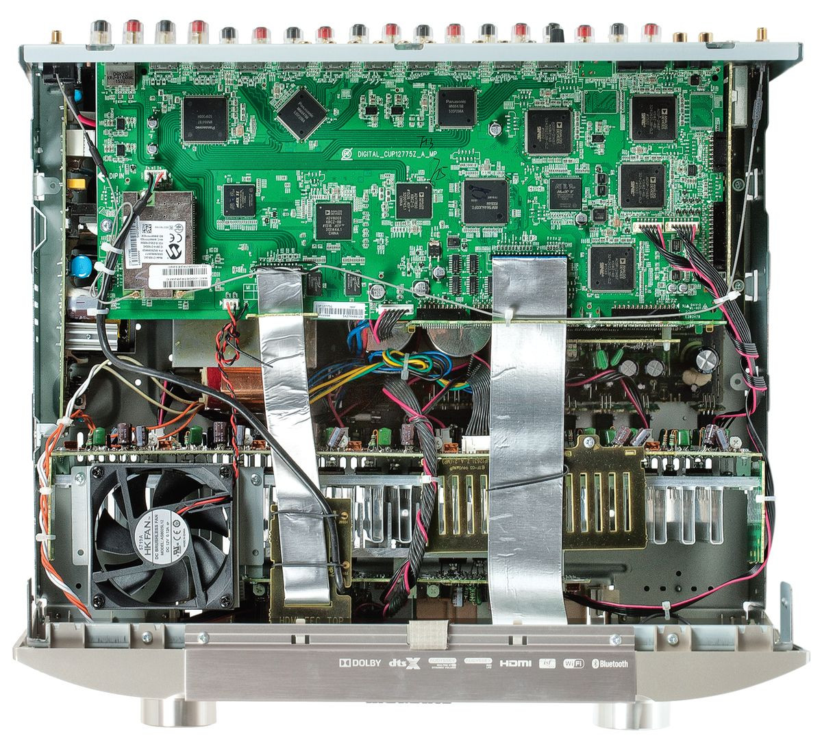 Wewnątrz, zgodnie z zewnętrzną architekturą gniazd, znajdujemy moduły zamontowane równolegle do tylnego panelu. Za nim, w niewielkiej odległości, znalazł się transformator zasilacza, całą końcówkę mocy zmieszczono na dwóch modułach (w wąskiej części złożono nawet razem dwa radiatory) za przednim panelem.