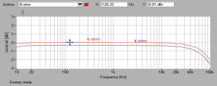 Czułość jest przy tym niemal wzorcowa (0,19 V), chociaż odstęp od szumu to już tylko -81 dB), a przez to dynamika sięga "tylko" 103 dB. W pasmie przenoszenia (rys.1) wszystko układa się dobrze, przy 10 Hz nie ma żadnego spadku, przy 100 kHz wynosi on -2 dB przy obciążeniu 8-omowym i -2,5 dB przy 4-omowym.