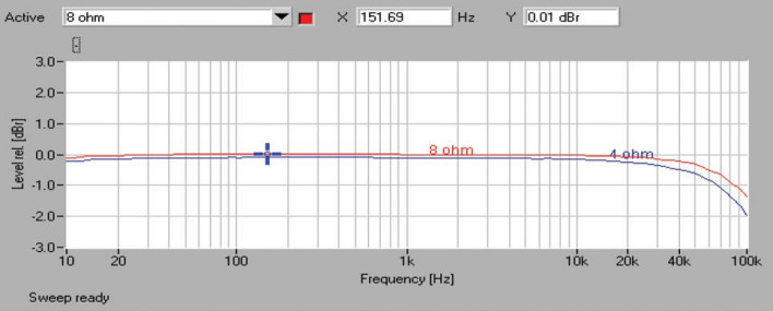 Charakterystyka THD+N poniżej 0,1 % jest dostępna dla mocy powyżej 2,2 W przy 8 omach i 3,7 W przy 4 omach.