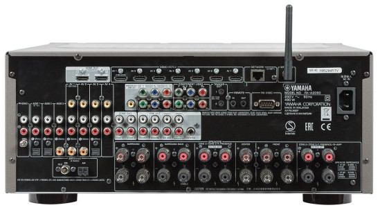 Tylny panel prawie w całości zajmują różne gniazda. Dużo miejsca przeznaczono na zaciski głośnikowe. Yamaha RX-A2050 ma dziewięć końcówek mocy i pozwala (przez przypisanie w menu) na wykorzystanie wolnych końcówek mocy do zasilania dodatkowych stref (2 i 3) lub zrealizowania bi-ampingu.
