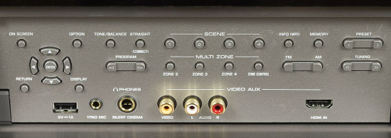 Dolna część przedniego panelu jest metalowa, górną pokryto pleksi - tam oczywiście ulokowano wyświetlacz. Metalowe gałki zostały osadzone w ozdobnych kołnierzach. Pod ciężką metalową klapką (odchylaną ręcznie) ukrywa się pokaźna liczba przycisków oraz podłączeń, między innymi: USB, HDMI, wyjście słuchawkowe, wejście AV, przyciski do aktywacji stref.