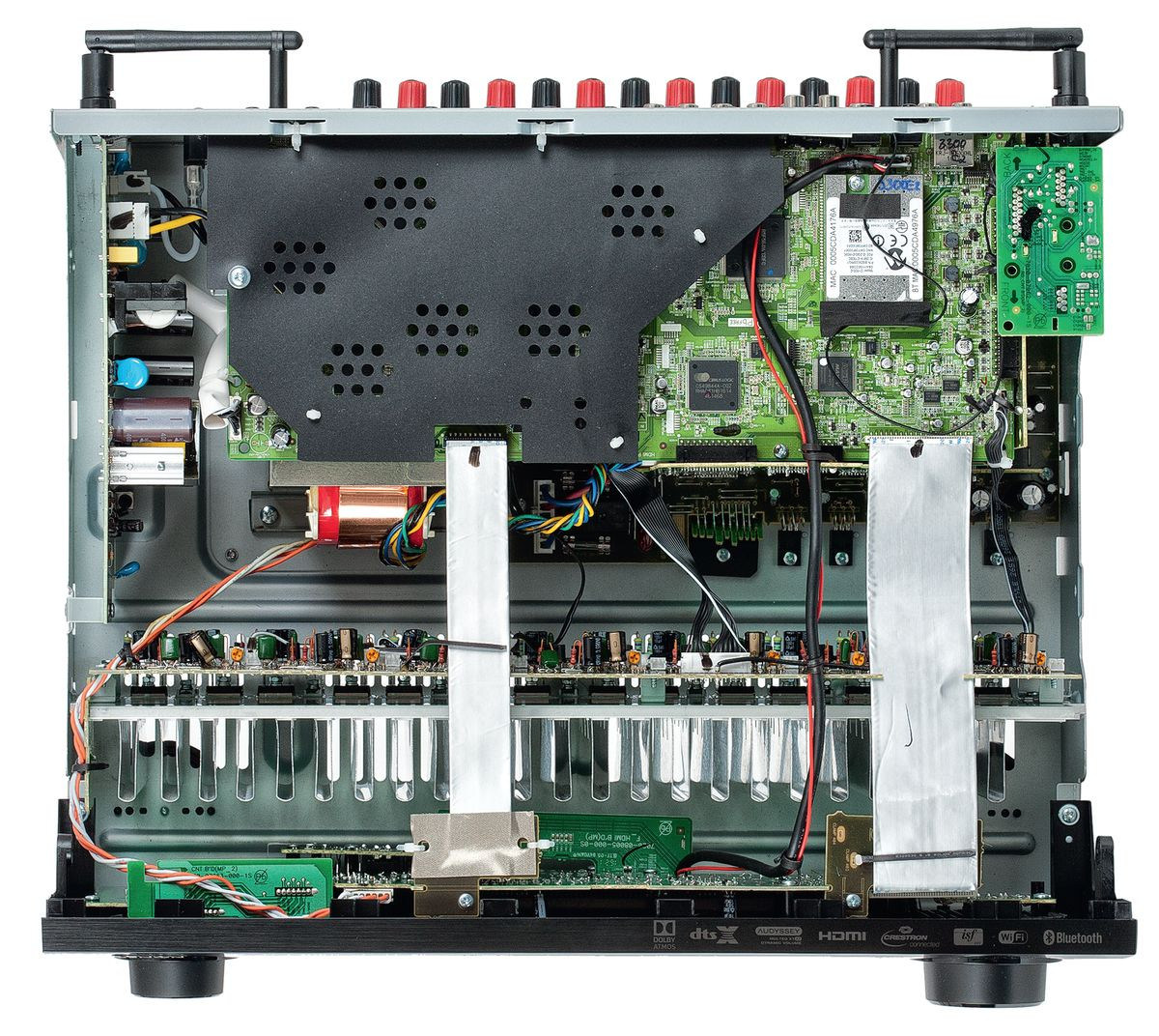 Dekodowanie dźwięku surround jest z kolei zadaniem dla procesora Cirrus Logic CS49844, pozwalającego na uruchomienie nie tylko standardu Dolby Atmos, ale także np. DTS:X. Ze względu na sposób montażu trudno w pełni rozszyfrować sekcję przetworników C/A. Wiemy, że częściowo opiera się ona na układach Burr Brown PCM5100 (sygnały 32 bit/384 kHz).