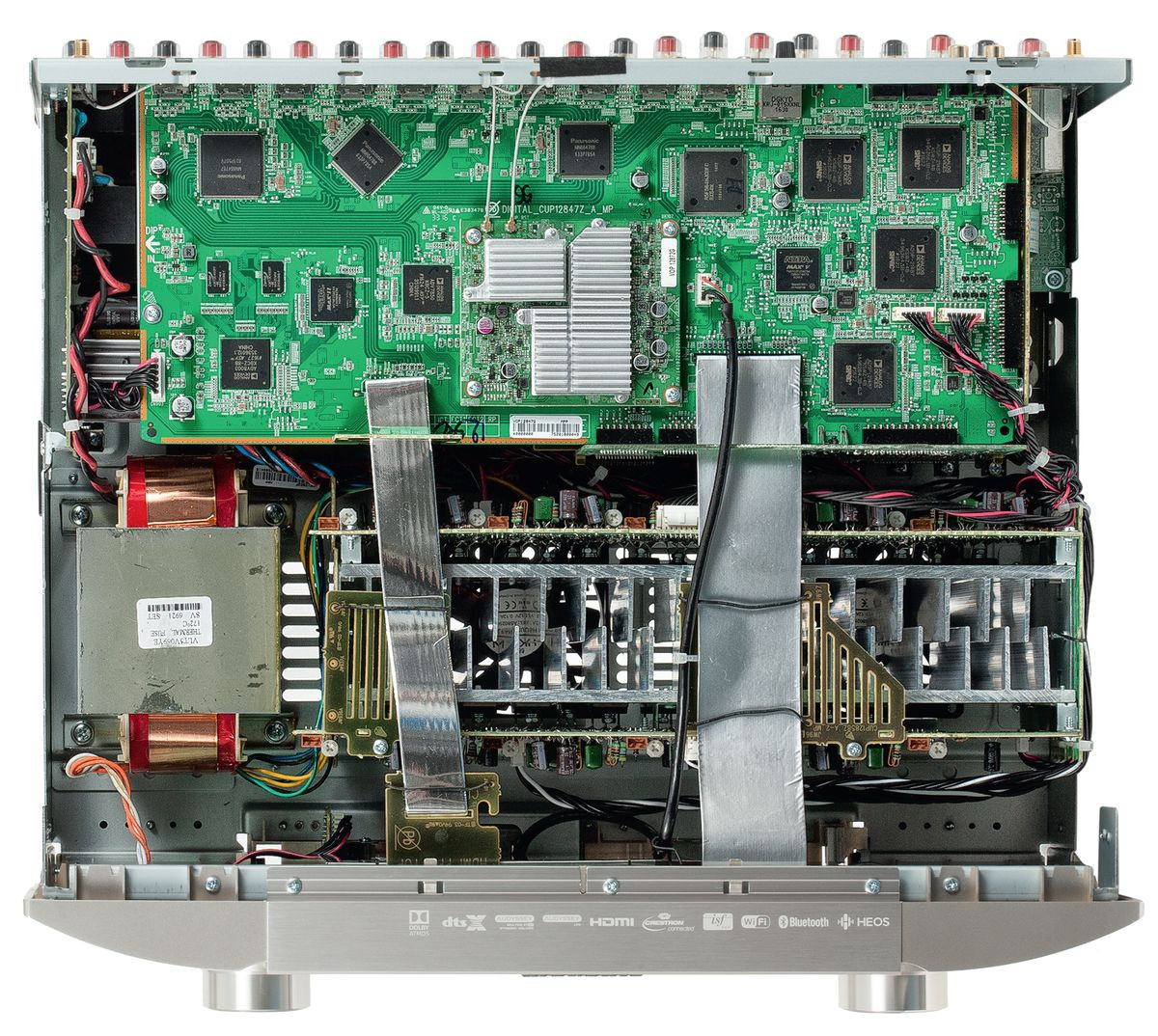 Cztery układy z rodziny Sharc służą zarówno do dekodowania bazowych standardów, jak i dalszej "zabawy" z trybami przestrzennymi oraz korekcją charakterystyk częstotliwościowych (system autokalibracji). W czeluściach pomiędzy przewodami można dostrzec konwertery cyfrowo-analogowe Burr Brown PCM5100, o wyśrubowanych parametrach 32 bit/384 kHz.