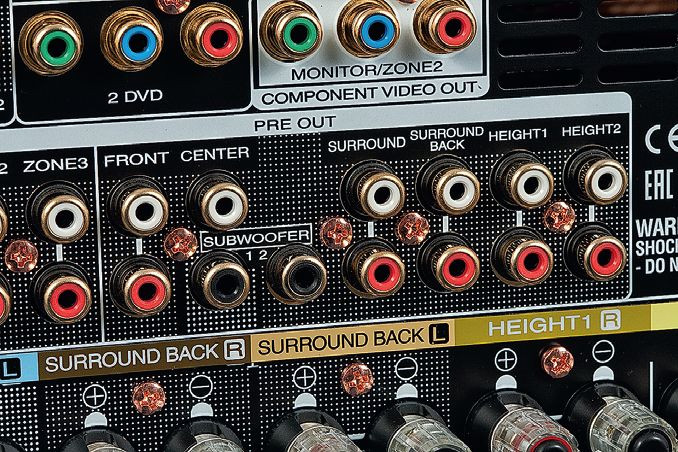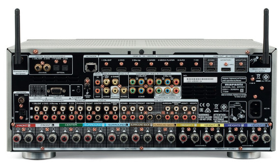 Zacisków głośnikowych (niewielkich, ale wygodnych) jest jedenaście par; o dwie więcej niż końcówek mocy. Marantz SR7011 dekoduje w systemie 11.2, więc dodatkowa para głośników będzie obsługiwana poprzez przełączenie wzmacniaczy. Każdy kanał można też obsłużyć zewnętrzną końcówką mocy - urządzenie ma odpowiedni komplet wyjść z procesora.