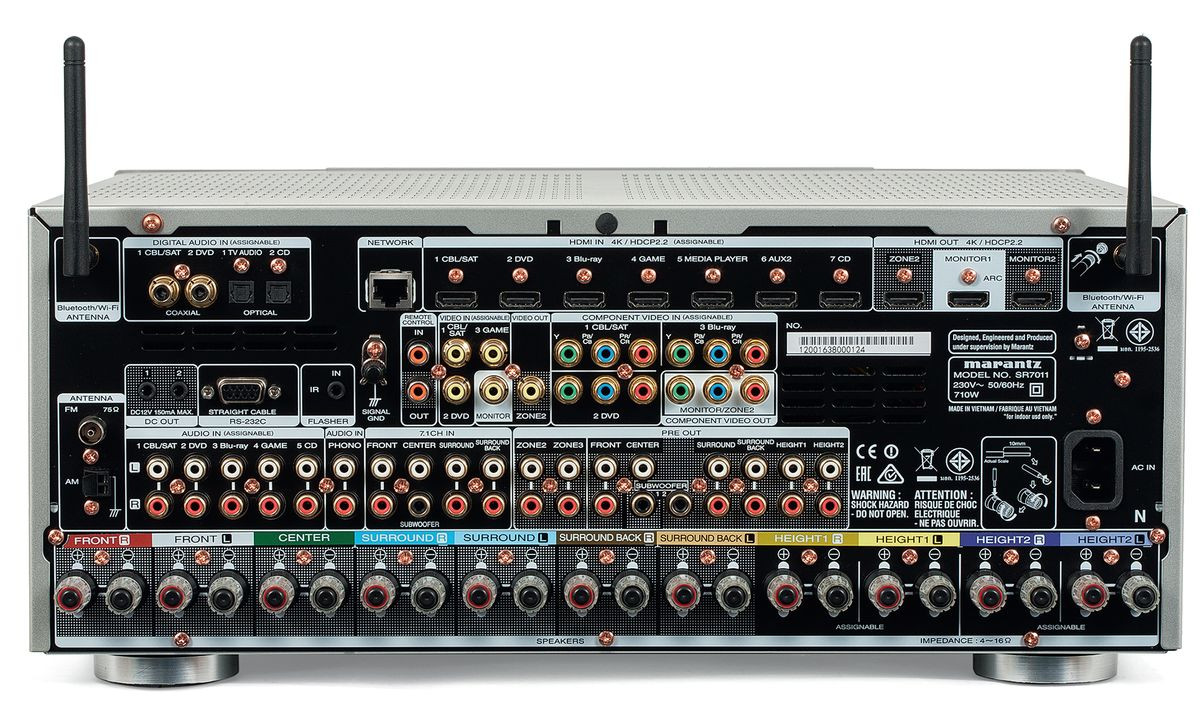 Marantz SR7011 ma sporo wejść audio, zarówno analogowych, jak i cyfrowych, jest też wejście gramofonowe (MM). Obecny jest także komplet 7.1 na zewnętrzny procesor (którego nie było w Denonie).