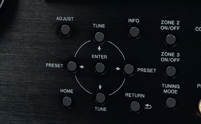 Pod klapką czai się stadko przycisków. Kilka z nich pozwala na wygodne wędrowanie po menu i, wbrew pozorom, czasami jest to wygodniejsze niż używanie pilota. Na przednim panelu są także przyciski uruchamiające dodatkowe strefy.