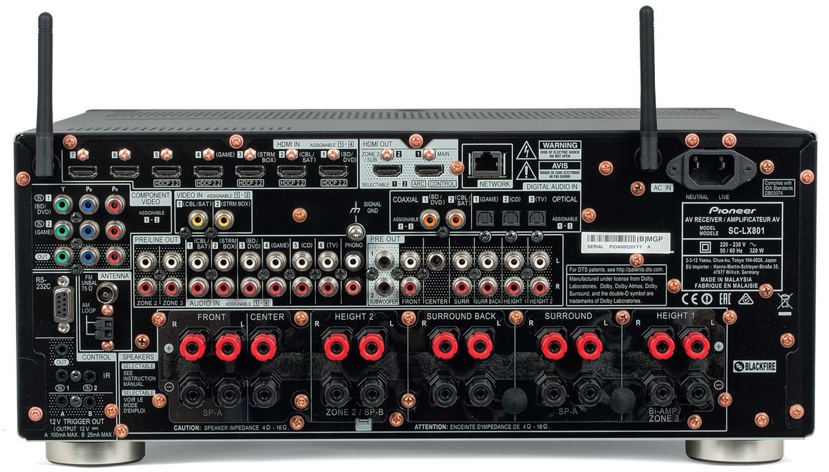Oprócz dwóch wyjść dla dodatkowych stref, imponujące jest wyjście 11.2 na zewnętrzne końcówki mocy. Pioneer SC-LX801 ma port szeregowy RS232, wejścia i wyjścia na zewnętrzne urządzenia IR oraz dwa wyjścia triggerowe 12V.