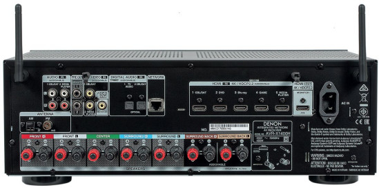 Chociaż komunikacja przenosi się sukcesywnie do rozwiązań bezprzewodowych, Denon AVR-X1400H ma także złącze LAN. Dwie anteny odpowiadają za transmisję Wi-Fi (dwuzakresowy moduł, 2,4 GHz oraz 5 GHz) oraz Bluetooth; ten ostatni jest mało użyteczny, gdyż ogranicza się do podstawowego (oferującego najniższą jakość) standardu SBC. Rozwiązania oparte na Wi-Fi (z założenia doskonalsze od BT) są mocną stroną AVR-X1400H i na nich powinniśmy bazować.