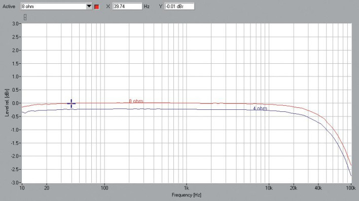 Świetnie prezentuje się charakterystyka przenoszenia (rys.1) z pomijalnym spadkiem przy 10 Hz, a przy 100 kHz mniejszym od -3 dB. W spektrum zniekształceń (rys. 2) zwraca uwagę trzecia harmoniczna, sięgająca -78 dB, przy -87 dB widać jeszcze drugą, pozostałe już poniżej -90 dB.