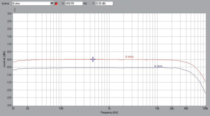 Żadnych zastrzeżeń nie można mieć do charakterystyk przetwarzania (rys.1), liniowość jest znakomita od granicy pomiaru przy 10 Hz, a przy 100 kHz spadki wynoszą odpowiednio -1,5 dB oraz -2,2 dB dla 8 i 4 Ω.