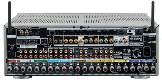 Aranżacja tylnej ścianki jest wynikiem umieszczenia na niej aż jedenastu par zacisków głośnikowych oraz rzędu HDMI – to obecnie najważniejsze, a czasami jedyne wykorzystywane gniazda.