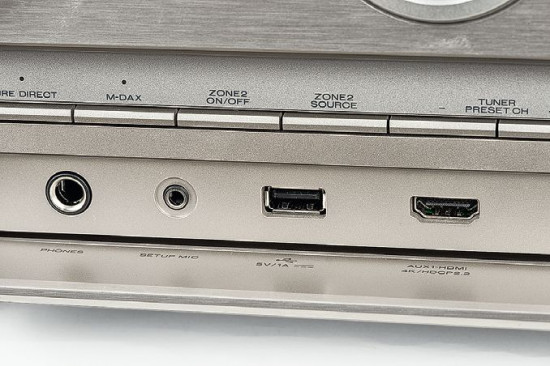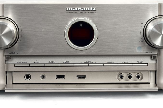 W Marantzu SR6012 panuje minimalizm, matryca wyświetlacza jest niewiele większa od pięciozłotówki, ograniczającą się do podstawowych informacji. Pod dużą klapką znajdziemy już wszystkie przyciski i gniazda. Jest podręczne wejście HDMI, USB (odczytuje pliki audio z nośników pamięci), wyjście słuchawkowe, a nawet wejście analogowe A/V (stereo RCA oraz obraz - kompozyt).