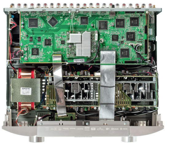 Amplitunery Marantza doczekały się integracji z systemem Heos, dzięki czemu mogą stać się częścią tego środowiska strefowego Wewnętrzna konstrukcja Marantza SR6012 jest bardzo podobna do AVR-X4400H Denona, więc nie będziemy jej ponownie opisywać.