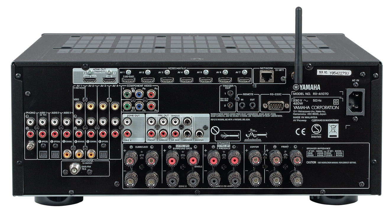 Zestaw gniazd na tylnej ściance prezentuje się nieco skromniej niż u konkurentów, co ma głównie (choć nie tylko) związek z mniejszą liczbą terminali głośnikowych (wynikającą z konfiguracji końcówek mocy), których w Yamaha RX-A1070 jest "tylko" dziewięć. Wzmacniaczy mamy siedem, dodatkowa para gniazd zapewnia elastyczność (np. bi-amping, druga strefa, przednie kanały efektowe Presence).