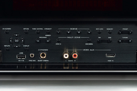 Przyjęto styl "czystego" frontu, ukrywając większość manipulatorów pod dużą klapką. Poza nią pozostały jedynie dwa "oczywiste" pokrętła - selektor źródeł oraz regulacja wzmocnienia, włącznik zasilania i specyficzny, wyeksponowany przycisk trybów bezpośrednich Pure Direct (odłączający wszystko, co zbędne, w tym wyświetlacz). Matryca jest duża, świeci delikatną bielą uzupełnioną czerwonymi akcentami.