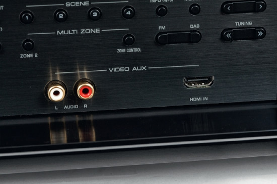 W strefie gniazd podręcznych mamy wyjście słuchawkowe, wejście na mikrofon kalibracyjny, USB (odtworzymy w ten sposób muzykę z nośników pamięci), HDMI oraz analogowe wejście RCA (bez towarzystwa kompozytowego obrazu).