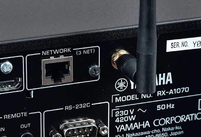 Wyjście (analogowe) z procesora to komplet 7.2. Chociaż za sterowanie odpowiadają protokoły sieciowe, to amplituner wciąż ma złącze RS232, a także złącza wyzwalaczy. Sygnały Wi-fi oraz Bluetooth korzystają z jednej anteny, to rozwiązanie typowe dla Yamahy, powiązane z konstrukcją modułu bezprzewodowego NW-01. Ograniczeniem jest tutaj brak standardu Wi-fi w pasmie 5 GHz (jest wyłącznie 2,4 GHz), ale potencjalne problemy znikają, gdy podłączymy RX-A1070 przez LAN.