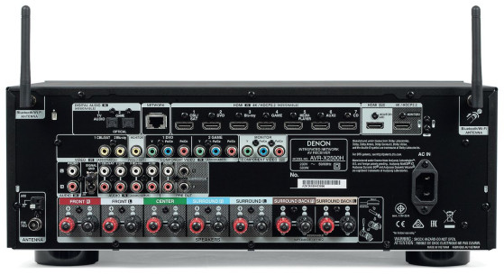 Denon AVR-2500H zaskoczył bogactwem sekcji HDMI, na tylnym panelu podłączymy aż siedem źródeł i dwa odbiorniki (np. telewizor i projektor). W ramach wszystkich złącz obowiązuje standard 4K (wraz z HDCP 2.2), urządzenie potrafi też skalować sygnał.