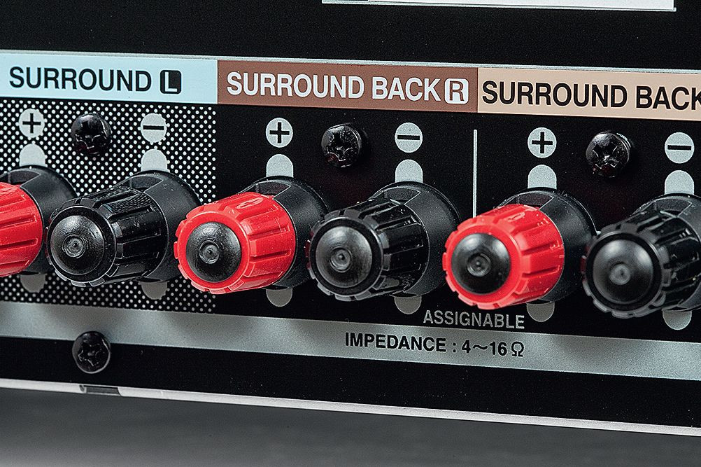 Liczba gniazd głośnikowych odpowiada liczbie końcówek mocy, chociaż sposobów ich wykorzystania może być kilka – nie tylko w formacie 7.2. Parę końcówek można oddelegować.