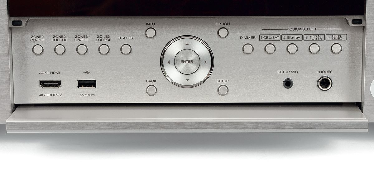 W wejściu podręcznym wciąż mamy HDMI (z 4K oraz HDCP 2.2), złącze USB-A (nośniki pamięci), wyjście słuchawkowe i wejście na mikrofon kalibracyjny; usunięto wejście analogowe.
