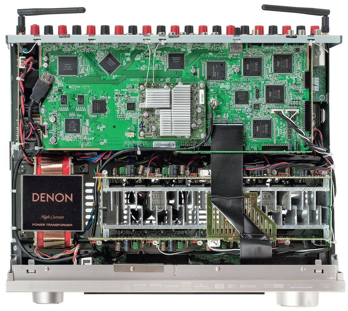 Wnętrze AVR-X4500H jest ściśle zagospodarowane. W relatywnie niewielką obudowę zapakowano aż dziewięć końcówek mocy, zajmujących wąski pas rozdzielonych pomiędzy dwa przytulone do siebie radiatory.