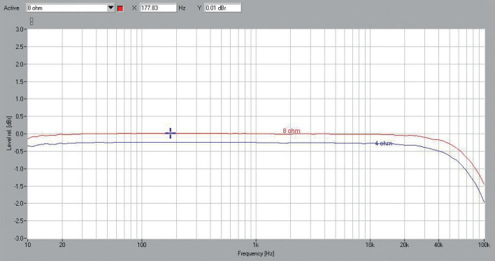 Charakterystyki przetwarzania (rys.1) wyglądają dobrze, spadki przy 100 kHz wynoszą ok. -1,5 dB dla 8 Ω i ok. -2 dB dla 4 Ω. W spektrum zniekształceń (rys.2) największy udział mają druga oraz trzecia harmoniczna (ale obydwie przy niskich -90 dB). Nietypowy kształt charakterystyk na rys. 3. wynika z działania selektora impedancji, przy 8 Ω uzyskujemy zarówno wyższą moc, jak i niższe THD+N.