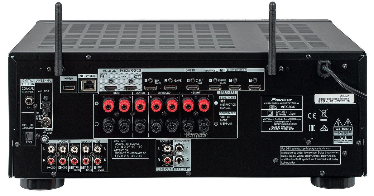 Pioneer VSX-934 ma oczywiście dekodery Dolby Atmos i DTS:X, ich najnowsze inkarnacje wirtualne, Dolby Atmos Height Virtualizer i DTS Virtual:X. Złącza HDMI obsłużą 4K wraz z formatami Dolby Vision, HDR10 i HLG.