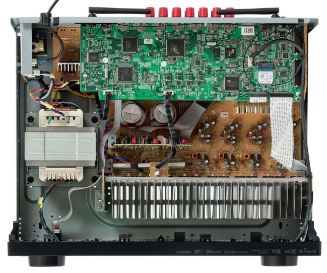 Wzmacniacze pracują w klasie AB, na jednym radiatorze znajduje się siedem par tranzystorów 2SA- 1941/2SC5198 Toshiby.