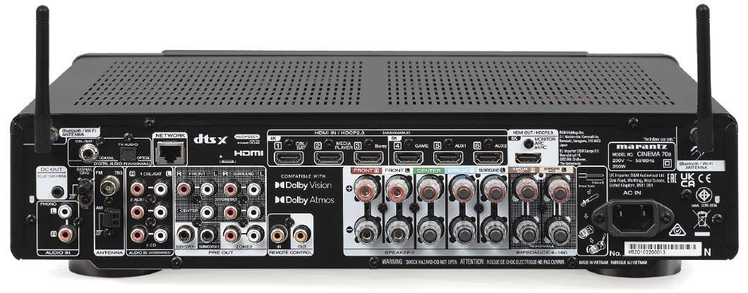 Zestaw gniazd na tylnej ściance Marantza Cinema 70S zupełnie wystarcza, tym bardziej że współczesne instalacje polegają głównie na HDMI. W tym zakresie 70S ma wyjście HDMI z nowoczesnym dodatkiem eARC i aż sześć wejść – trzy dla źródeł 4K i trzy w standardzie 8K (chociaż dostępność takich materiałów jest sprawą przyszłości).