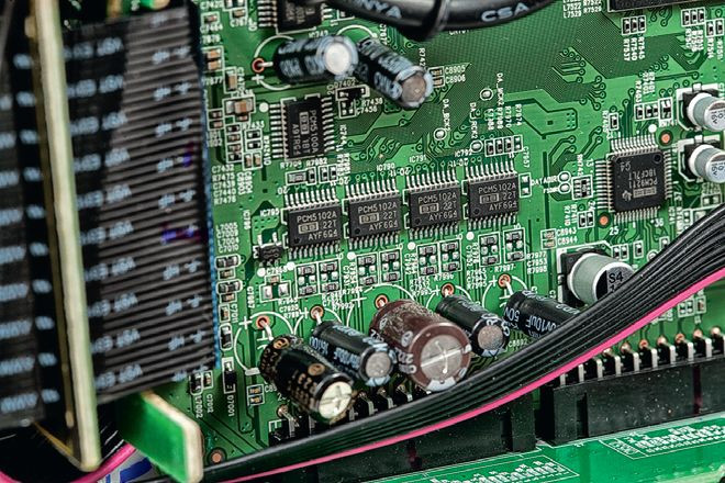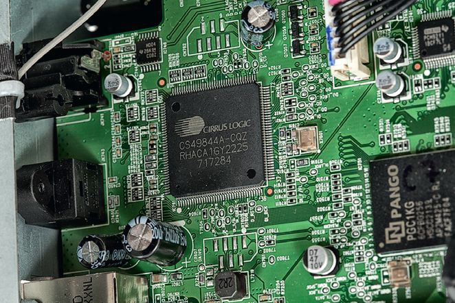 Na górze znajduje się sekcja HEOS (podłączono do niej dwie anteny), poniżej główny moduł cyfrowy, a w nim dekoder surround Cirrus Logic CS49844 (obsługujący zarówno Dolby Atmos, jak i DTS:X) oraz rozbudowana aranżacja przetworników cyfrowo-analogowych – Burr Brownów z rodziny PCM5100. Takie konfiguracje Marantz i Denon stosowali już wcześniej, tutaj nie ma innowacji i niespodzianek, chociaż wygląda to wciąż bardzo solidnie.
