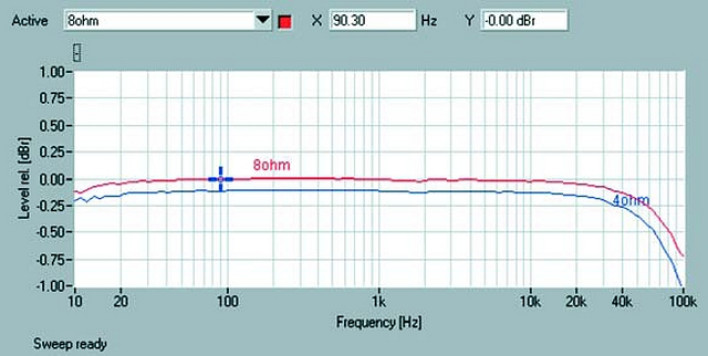 Jak widać z rys.1, pasmo przenoszenia wzmacniacza nie ma się czego wstydzić. W polu +/-1dB zmieścił się cały mierzony zakres, a więc 10Hz- 100kHz. Występują nieznaczne rozbieżności dla testowanych impedancji, wraz z 8 omami przy 100kHz pojawia się -0,8dB, a wraz z 4 omami ok. -0,9dB. Przy 10Hz mamy -0,1dB (!!!). Życzyłbym tego każdemu wzmacniaczowi. Widać jednak różnicę wzmocnień napięciowych. Po takim piecu spodziewaliśmy się też wyższego współczynnika tłumienia, niż skromne 29 w odniesieniu do 8 omów.