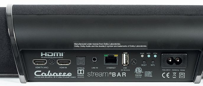 Cabasse Stream Bar jest wyposażony w dość skromną, ale praktyczną paletę gniazd. W sekcji HDMI dostajemy zaledwie jedno wejście i jedno wyjście, to drugie z ARC, pozwalając na efektywną komunikację soundbara i telewizora. Jedno wejście (HDMI) przeważnie narzuca podłączanie źródeł do samego telewizora, tym bardziej, że nie ma on dekoderów dźwięku HD, a posługuje się przede wszystkim bazowym Dolby Digital.