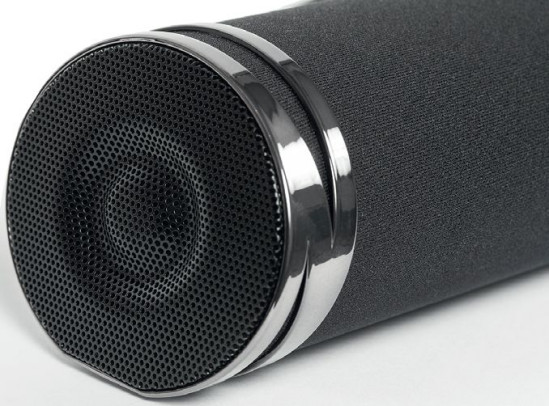Cabasse Stream Bar wygląda luksusowo, a przy tym lekko i oryginalnie. Jednostka główna jest w przekroju okrągła, zaledwie delikatnie ścięta, aby uformować stopkę służącą do stabilnego ustawienia. W środkowej części na "rurę" założono srebrne pierścienie, podobnymi wykończono boki.