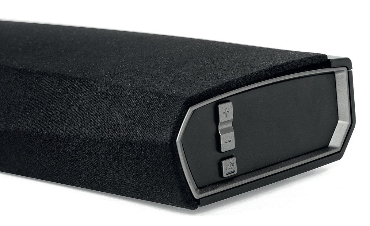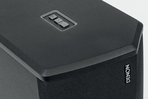 Subwoofer, podobnie jak soundbar, ma panel sterujący z trzema przyciskami: do zmiany głośności oraz szybkiego wyciszenia (w ramach całego systemu). Subwoofer jest pełnoprawnym członkiem rodziny HEOS, ma więc z tyłu wejścia audio (USB i analogowe), można do nich podłączyć źródło i swobodnie w ten sposób strumieniować.