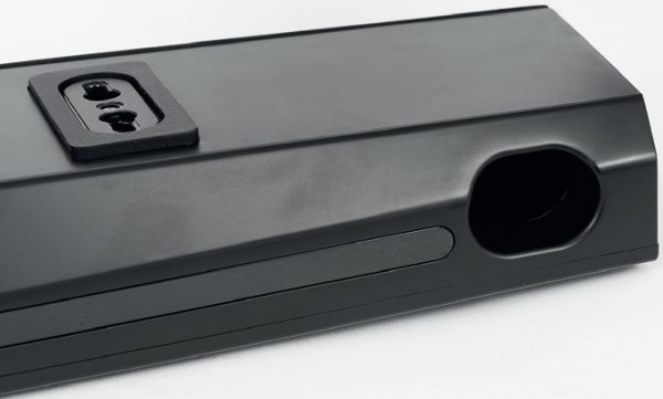 Na tylnej ściance widać otwory bas-refleks, należy o tym pamiętać ustawiając urządzenie na szafce. Przy montażu pionowym obracamy belkę o 90 stopni (ścięciem frontu w górę), więc nie ma to już większego znaczenia, tunele bas-refleks promieniują w dół.