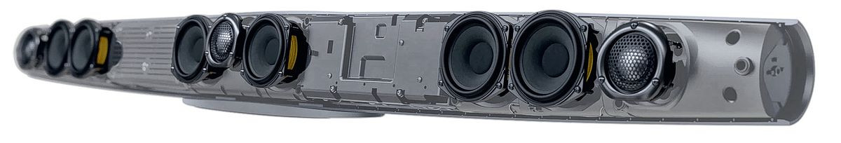 W sekcjach bocznych (odpowiadających kanałom L i P) przetwornik wysokotonowy znajduje się na zewnątrz, oczywiście w celu rozszerzenia bazy stereo do granic wyznaczonych przez długość belki.