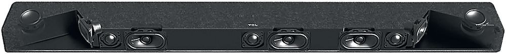 Większa część górnej i przedniej ścianki jest zasłonięta miękkim materiałem maskownicy, za którymi są ukryte soczewki akustyczne Ray Danz. TCL C935U to konfiguracja 5.1.2, a więc w ogólnym zarysie taka jak w Samsungu HW-Q800B, chociaż szczegóły układu akustycznego są różne.