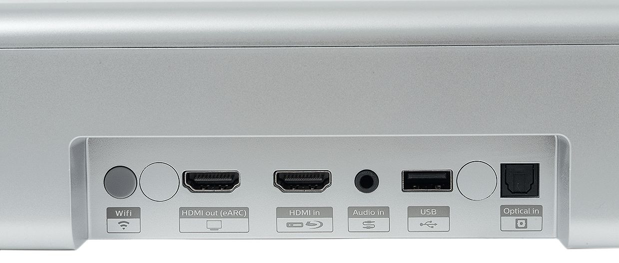 Możliwości przyłączeniowe Philipsa TAB8507 są kapitalne. Do dyspozycji mamy nie tylko wyjście HDMI (z dodatkiem eARC), ale także wejście w tym standardzie, a dodatkowo są wejście analogowe (mini jack) i cyfrowe (optyczne). Jest też USB do odczytu muzyki z nośników pamięci.