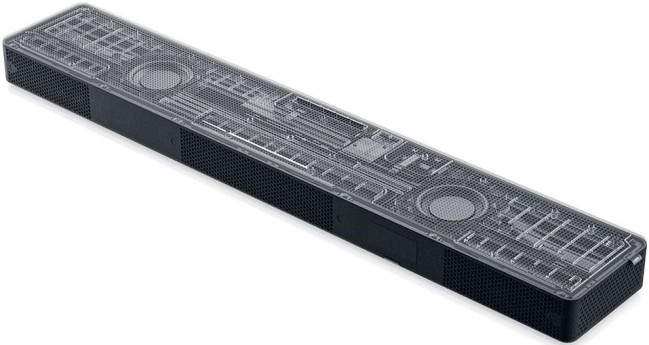 Pod górnymi perforacjami wypatrzymy dwa przetworniki. Już witamy się z gąską i kanałami "sufitowymi" Dolby Atmos… a tutaj rozczarowanie albo wręcz przeciwnie – ulga, bo zamiast naciąganych atmosowych gadżetów, są to 10-cm (bardzo duże jak na soundbar) przetworniki niskich częstotliwości, dzięki którym listwa radzi sobie bez wsparcia subwoofera.