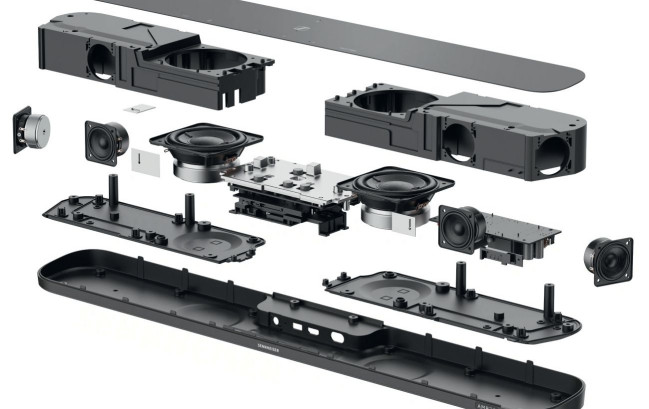 Na froncie Sennheisera Ambeo Mini zainstalowano dwa 4-cm przetworniki szerokopasmowe (z membranami celulozowymi), kolejne dwa znajdują się na "przełamaniu" frontu i bocznych ścianek, więc są skierowane lekko na zewnątrz – ich promieniowanie może wywoływać odbicia od ścian pomieszczenia.