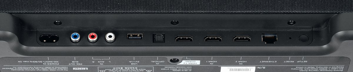 W tylnej części obudowy znajduje się całkiem obszerny panel przyłączeniowy. Chociaż standardem jest dzisiaj pojedynczy przewód HDMI biegnący do telewizora (wraz z kanałem zwrotnym eARC), to Sennheiser Ambeo Plus ma jeszcze dwa dodatkowe wejścia HDMI, wejście optyczne, a nawet liniowe wejście analogowe (klasyczna para RCA).