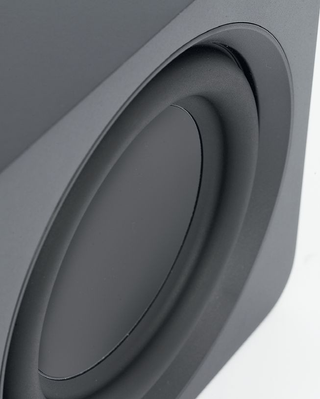 Nowy subwoofer jest znacznie mniejszy, ma formę dyskretnej kostki, której schować się wprawdzie nie da, ale nie będzie ona przeszkadzać. Zmniejszeniu objętości sprzyja układ z membraną bierną. Membrana może być bierna, ale subwoofer jako całość oczywiście jest aktywny (ma wbudowany wzmacniacz) i bezprzewodowy (sygnał z soundbara).