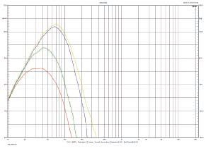 Widzimy więc "naturalną" charakterystykę obudowy zamkniętej, opadającą przy najwyższym filtrowaniu już od 70 Hz, którą może modyfikować tylko filtrowanie dolnoprzepustowe, przesuwające szczyt wierzchołka w lewo, ale jednocześnie w dół - stąd zmieniający się poziom odniesienia dla ustalania spadku -6 dB. Na prawym zboczu częstotliwość graniczna jest regulowana w dość wąskim zakresie 70-110 Hz (oznaczenia przy pokrętle - 30 - 120 Hz...), do tego dochodzi jeszcze, sięgająca tylko 10 Hz dalej, charakterystyka LFE.